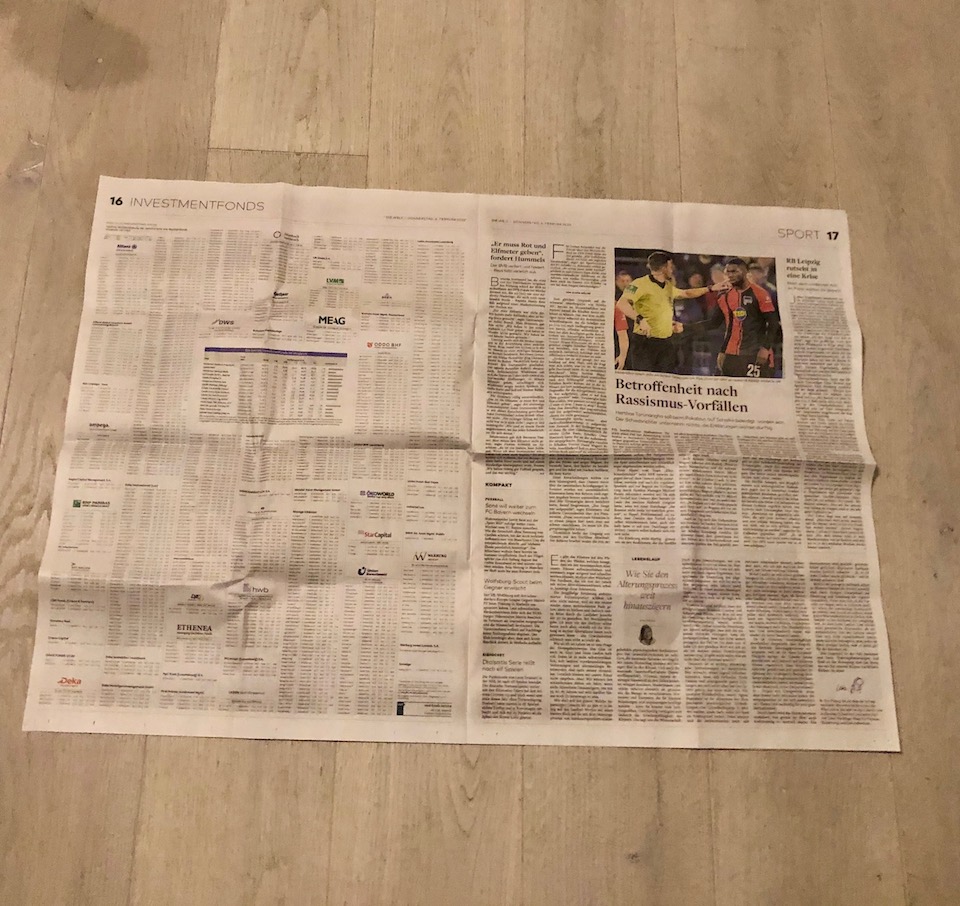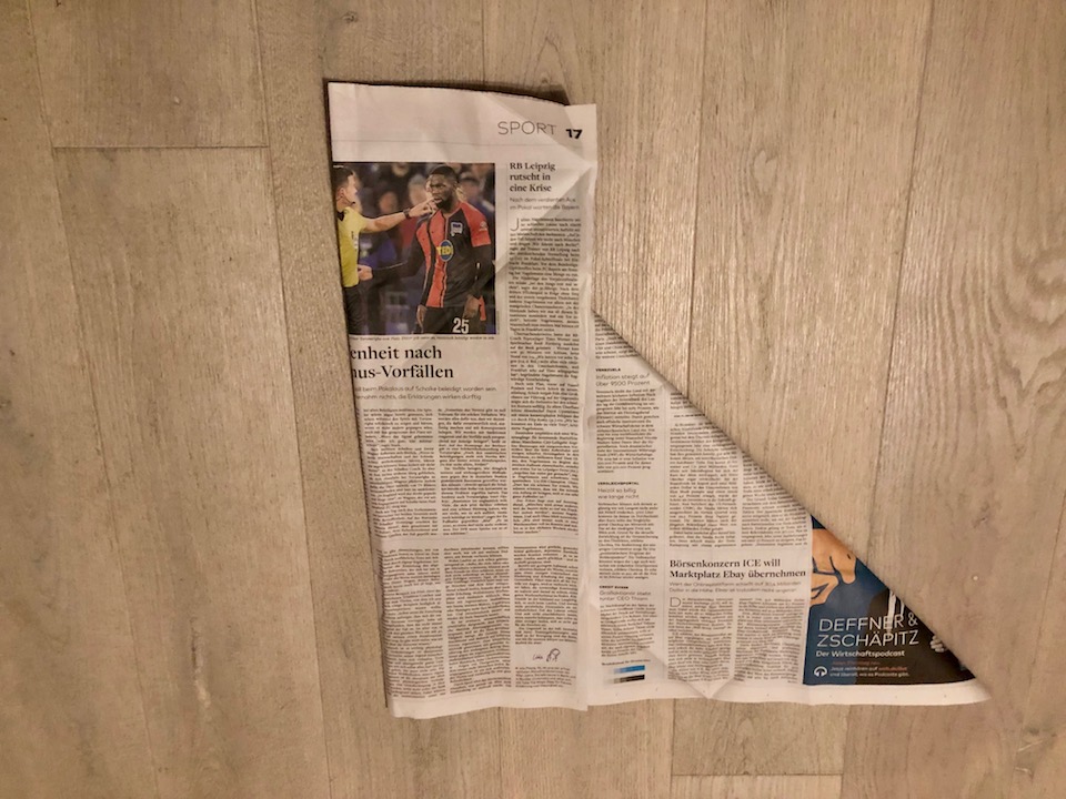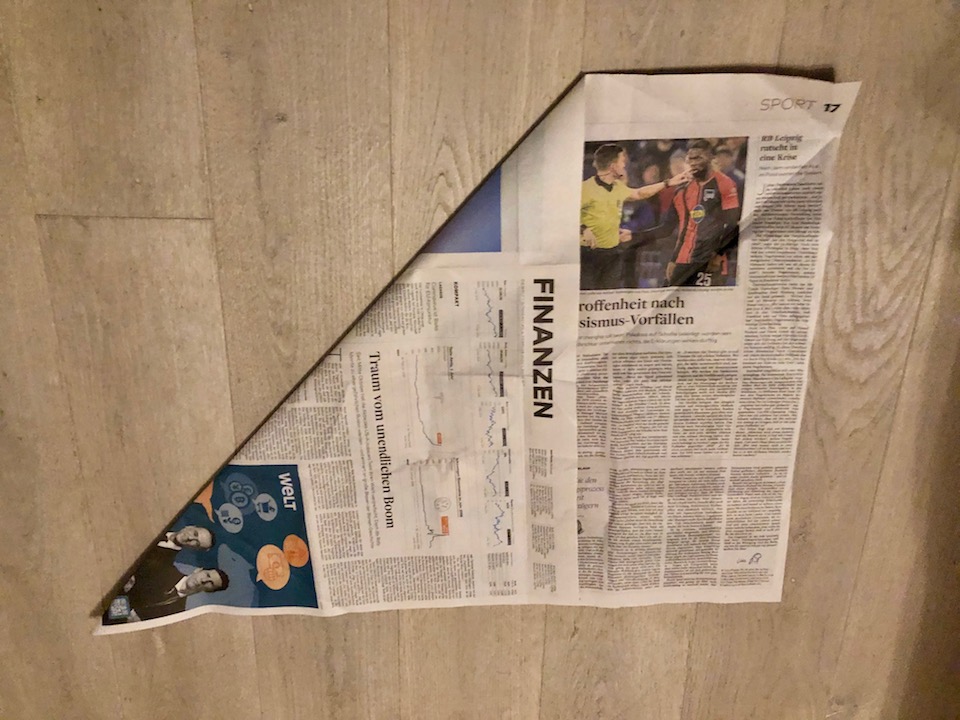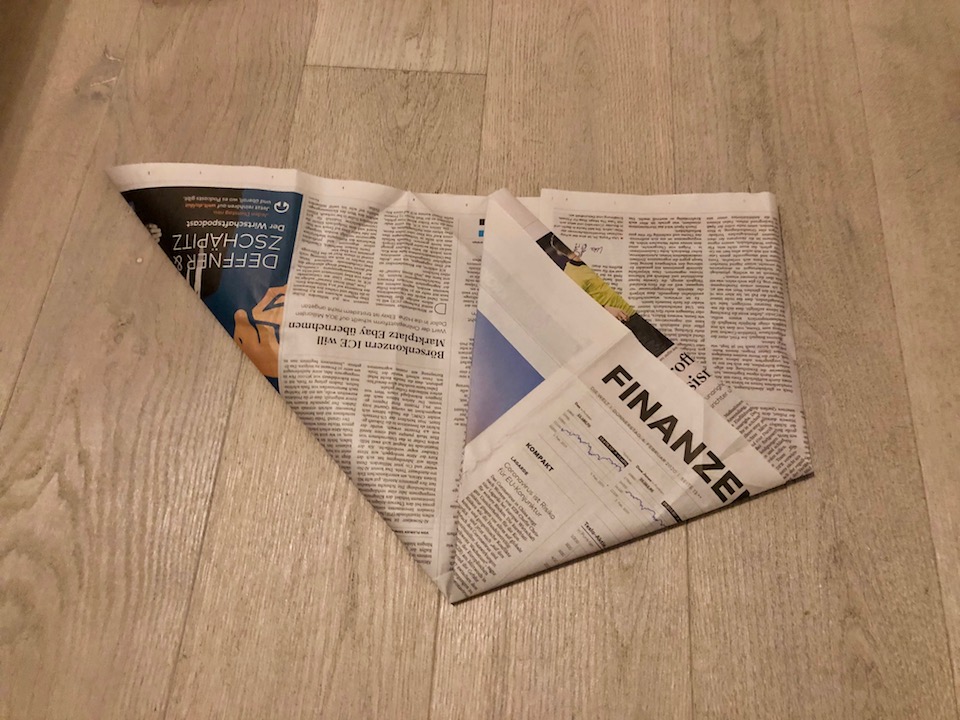 Alles, was ihr braucht, ist eine alte, großformatige Zeitung- zum Beispiel eine Tageszeitung. Ihr braucht weder Schere noch Kleber und könnt also gleich loslegen.