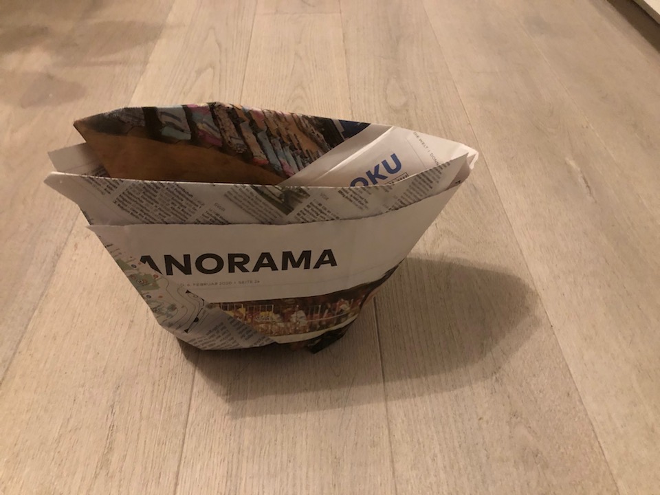 Um ehrlich zu sein, habe ich ein paar Anläufe gebraucht, bis ich die richtige Falttechnik herausgefunden habe. Das Müllsackerl aus Zeitungspapier eignet sich eher für den Biomüll – oder für einen sehr müllreduzierten Haushalt.
