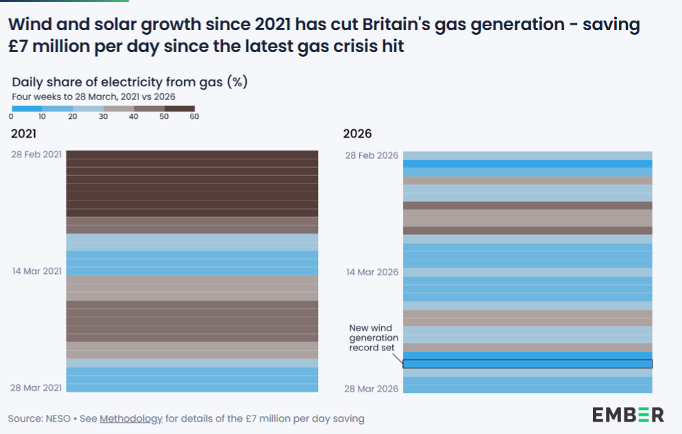 Laut Ember hat der massive Ausbau von Wind‑ und Solarenergie in den vergangenen Jahren die britische Stromversorgung deutlich stabiler gemacht. Besonders Offshore‑Wind spielt dabei eine zentrale Rolle: Jede zusätzliche erzeugte Kilowattstunde aus Windkraft reduziert die Menge an Gas, die zur Stromproduktion benötigt wird.