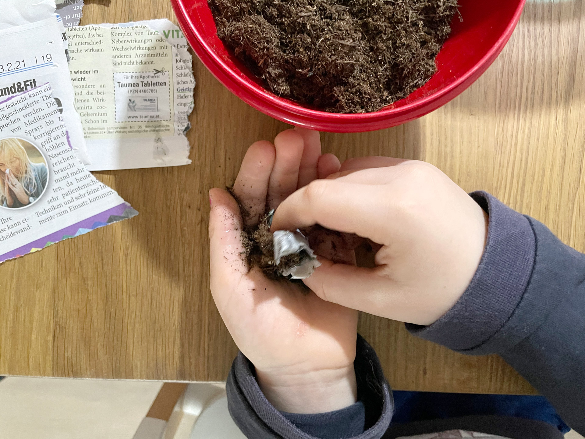 Nehmt nun etwas von der Erdmischung und mischt ein bisschen von dem Papierbrei darunter. Das Ganze ist noch sehr bröselig und hält nicht zusammen. Nehmt daher ein Stück Zeitungspapier (am besten zwei Lagen), gebt eure Mischung in die Mitte und ummantelt die Mischung mit dem Papier. Drückt das Stück zu einer Kugel zurecht und überschüssiges Wasser noch ein bisschen raus. Nun legt ihr die Kugel auf einen Teller und wiederholt das Ganze so lange, bis eure Samenmischung aufgebraucht ist.
