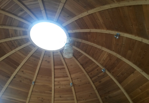 Spanten-Dome, wie sie von DI Reinhard Hesse von Paideuma Dome gebaut werden, haben einen stärkeren Anspruch darauf, wirklich rund zu sein. Sie bestehen aus 16 oder 24 speziell zugeschnittenen abgerundeten Spanten, die dann je nach Anforderung verkleidet werden.