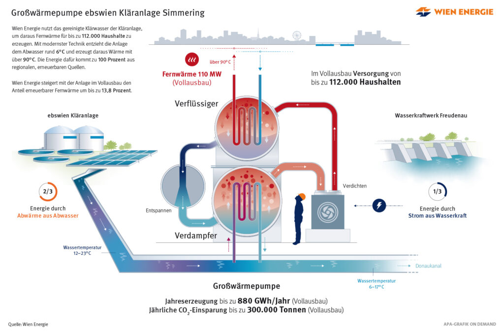Bereits in der ersten Ausbaustufe können bis zu 56.000 Wiener Haushalte mit grüner Fernwärme versorgt werden. Die Abwärme der Kläranlage die zuvor ungenutzt in den Donaukanal geleitet wurde, ist nun für die klimaneutrale Wärmeversorgung aufgeschlossen. Darüber hinaus wird die Großwärmepumpen-Anlage mit 100 Prozent Strom aus erneuerbaren Energien betrieben. Für die erste Ausbaustufe investierte Wien Energie 70 Millionen Euro. Die aktuell drei errichteten Wärmepumpen werden bis 2027 in einem nächsten Schritt mit drei weiteren Anlagen komplettiert. Im Vollausbau bedeutet das Fernwärme mit einer Leistung von ca.110 Megawatt.