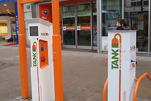 Das obere Bild zeigt den neuen Wiener E-Tankstellen-Stil. Zum Vergleich: das bisherige Erscheinungsbild der E-Tankstellen ist auf dem unteren Bild dargestellt.