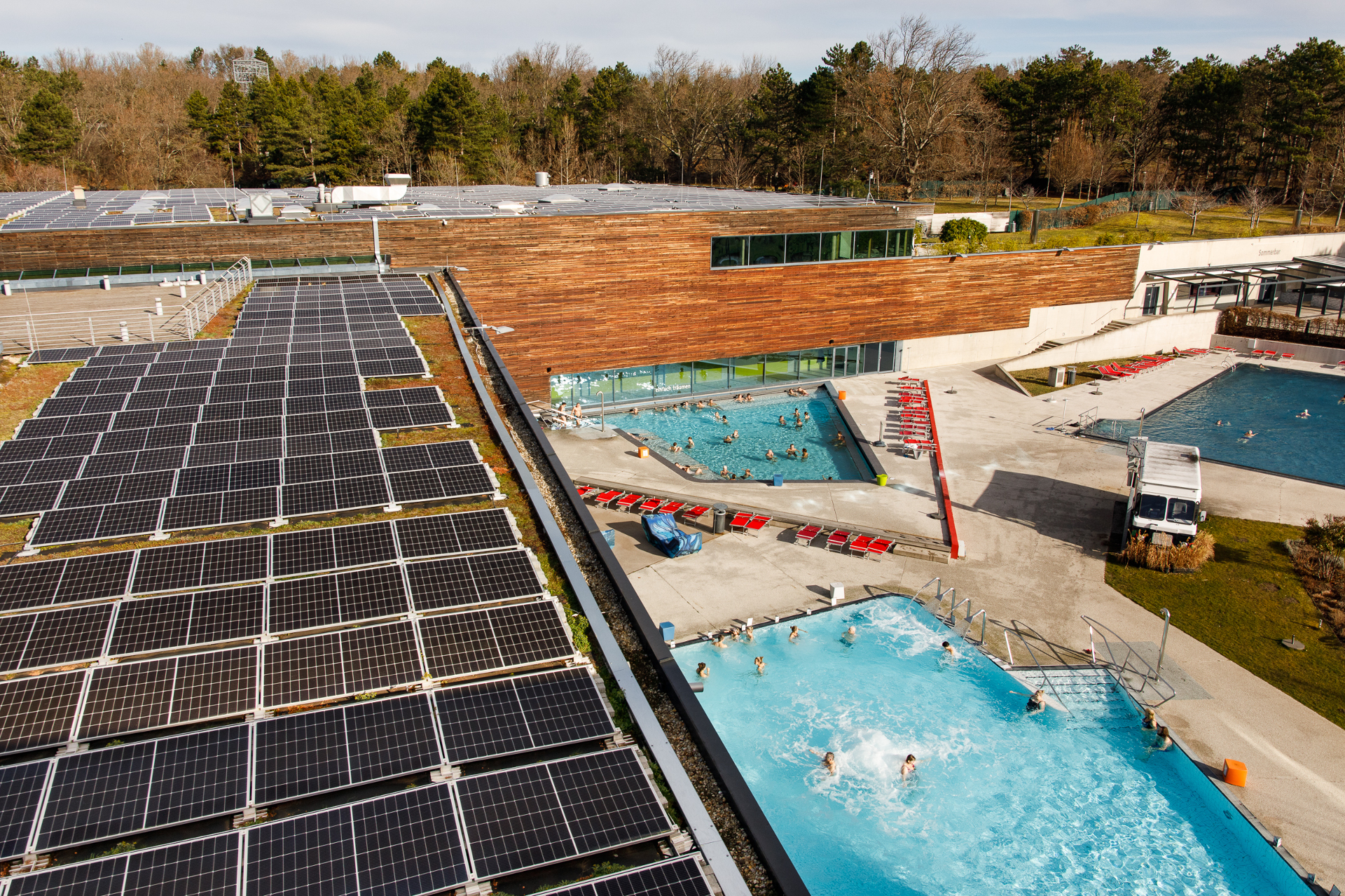 In Kooperation mit Wien Energie wurde nach zwei Wärmepumpen nun auch eine Photovoltaikanlage mit 800kWp auf den Dächern der Therme Wien in Betrieb genommen. Die PV-Anlage wird jährlich 820.000 Kilowattstunden Strom produzieren, der direkt zur Versorgung der Thermenanlagen genutzt wird.
