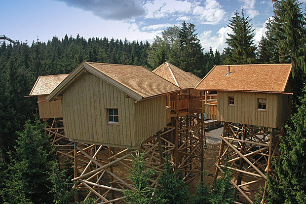- Mitten im Baumkronenweg Innkreis in Kopfing (Oberösterreich) thronen sechs auf Stelzen gebaute Baumhäuser. Paare und Familien können hier in rund zehn Meter Höhe mitten in den Wipfeln hausen. Zwei der Baumhäuser sind Gruppenhäuser und versprechen lustige Abende mit Schlafsack und Waldromantik.