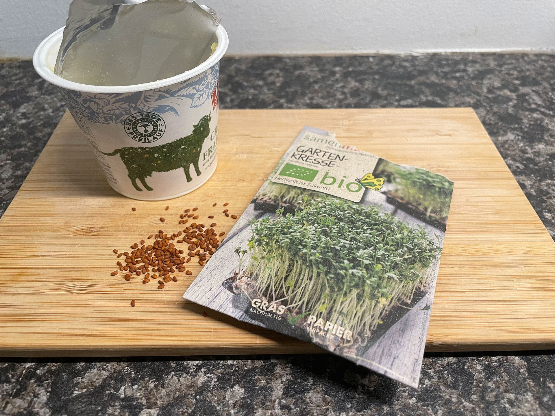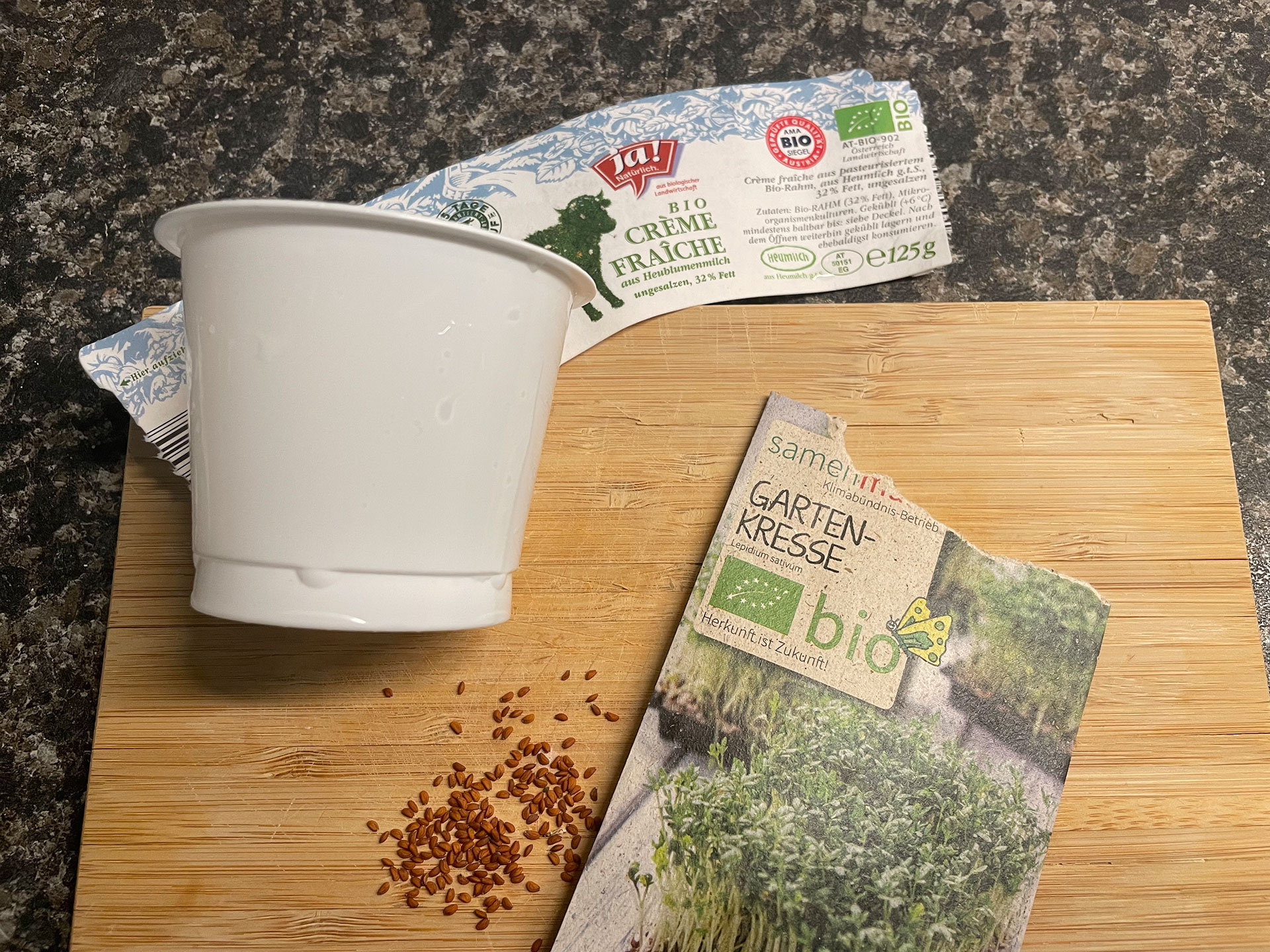 Ein leerer Joghurtbecher (oder auch jeder andere Becher, von Sauerrahm, Creme fraiche etc.) kann direkt in den Mistkübel wandern, oder noch ein zweites Leben bekommen und so einen etwas kleineren ökologischen Fußabdruck hinterlassen. Als Anzuchtbecher im Frühjahr sind solche Becher ja weithin bekannt. Ihr könnt aber auch in anderen Jahreszeiten etwas in die Becher anpflanzen. Für kleine Kräuter in der Küche eignen sie sich perfekt.